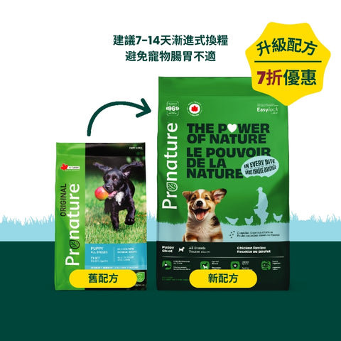 為避免寵物腸胃不適,建議採用7-14天的漸進式換糧法,逐步將現有狗糧替換為Pronature專業犬糧。