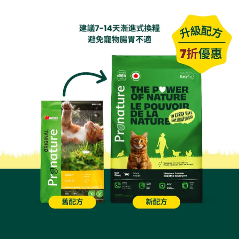 為避免寵物腸胃不適,建議採用7-14天的漸進式換糧法,逐步將現有狗糧替換為Pronature專業犬糧。